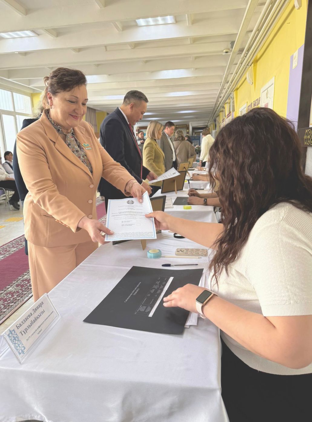 Таңғы сағаттардан бастап учаскеде ұйымдасқан әрі тыныш атмосфера қалыптасты. Депутаттар топпен келіп, учаскелік комиссия мүшелері мен бақылаушылармен амандасты. Одан кейін тіркеуден өтіп, бюллетеньдерін алды. Әрқайсысы өз таңдауларын жасап, толтырылған бюллетеньдерді дауыс беру жәшігіне салды.