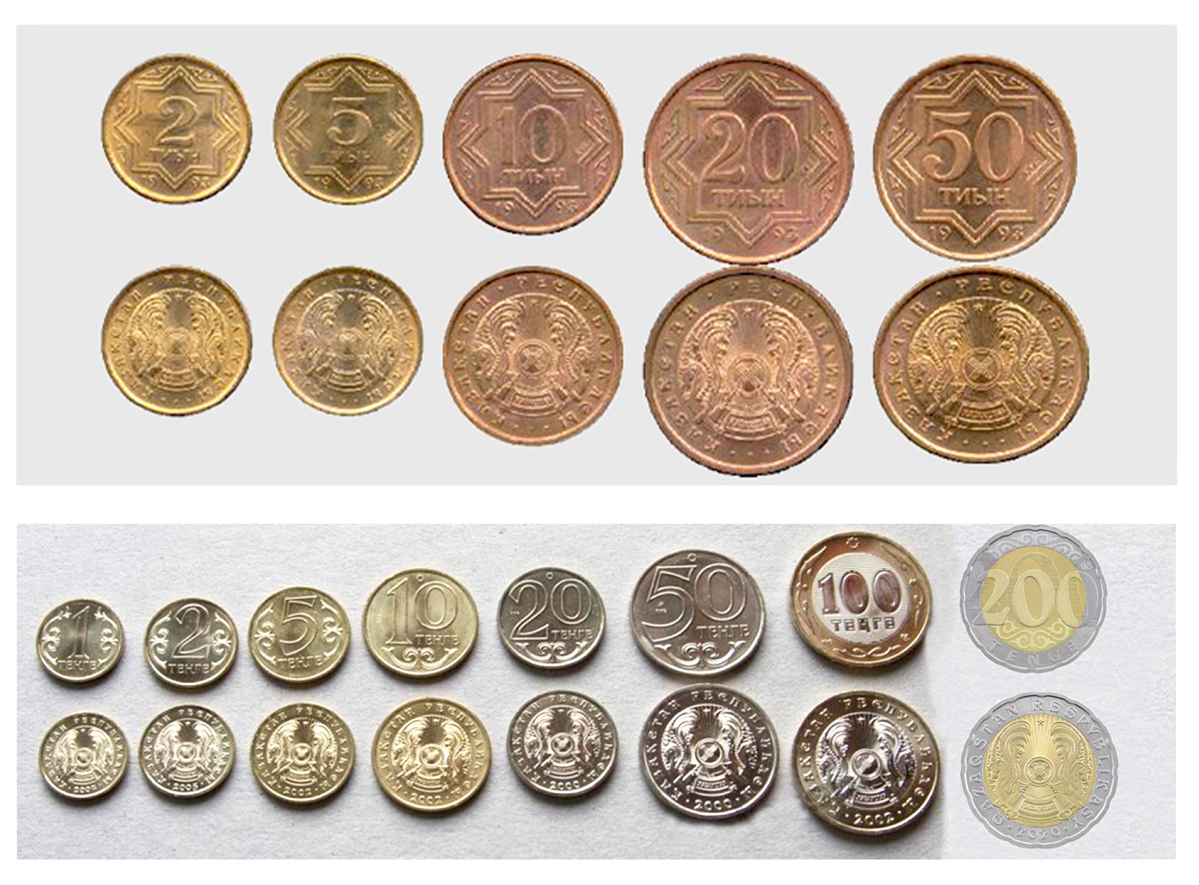 Қағаз ақша қолданысқа енгізілген соң бірнеше айдан кейін теңгелер шығарыла бастады. 1994 жылдың басында теңгелік монеталар 1, 3, 5, 10 және 20 теңгелік номиналдарда, сондай-ақ қағаз тиындардың орнына 2, 5, 10, 20 және 50 тиындық монеталар шығарылды. Дегенмен, теңгелік монеталардың салыстырмалы түрде үлкен өлшемі және кейбір монеталардың номиналының кіші болуы төлемдер мен сақтауда қиындықтар туғызды. Сондықтан 1997 жылы бұрынғы ұсақ номиналдағы монеталар мен банкноттарды ауыстыруға арналған теңгелік монеталардың жаңа сериясы (1-ден 50 теңгеге дейін) бекітілді. Кейінірек 2 және 100 теңгелік монеталар енгізілді. Соңғы 200 теңгелік монета 2020 жылы